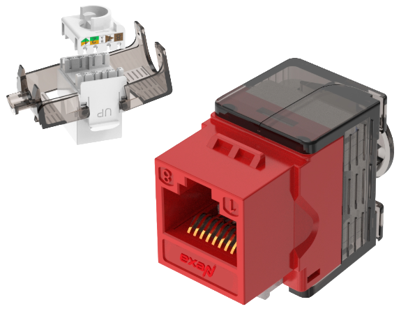 High-performance jack exceeding TIA/EIA and ISO standards. Supports T568 A&B wiring with dual termination (110/Krone) and 180° orientation. Reduces insertion loss and alien crosstalk, with built-in strain relief. Available in multiple colours for patch panels, faceplates, and shutters.